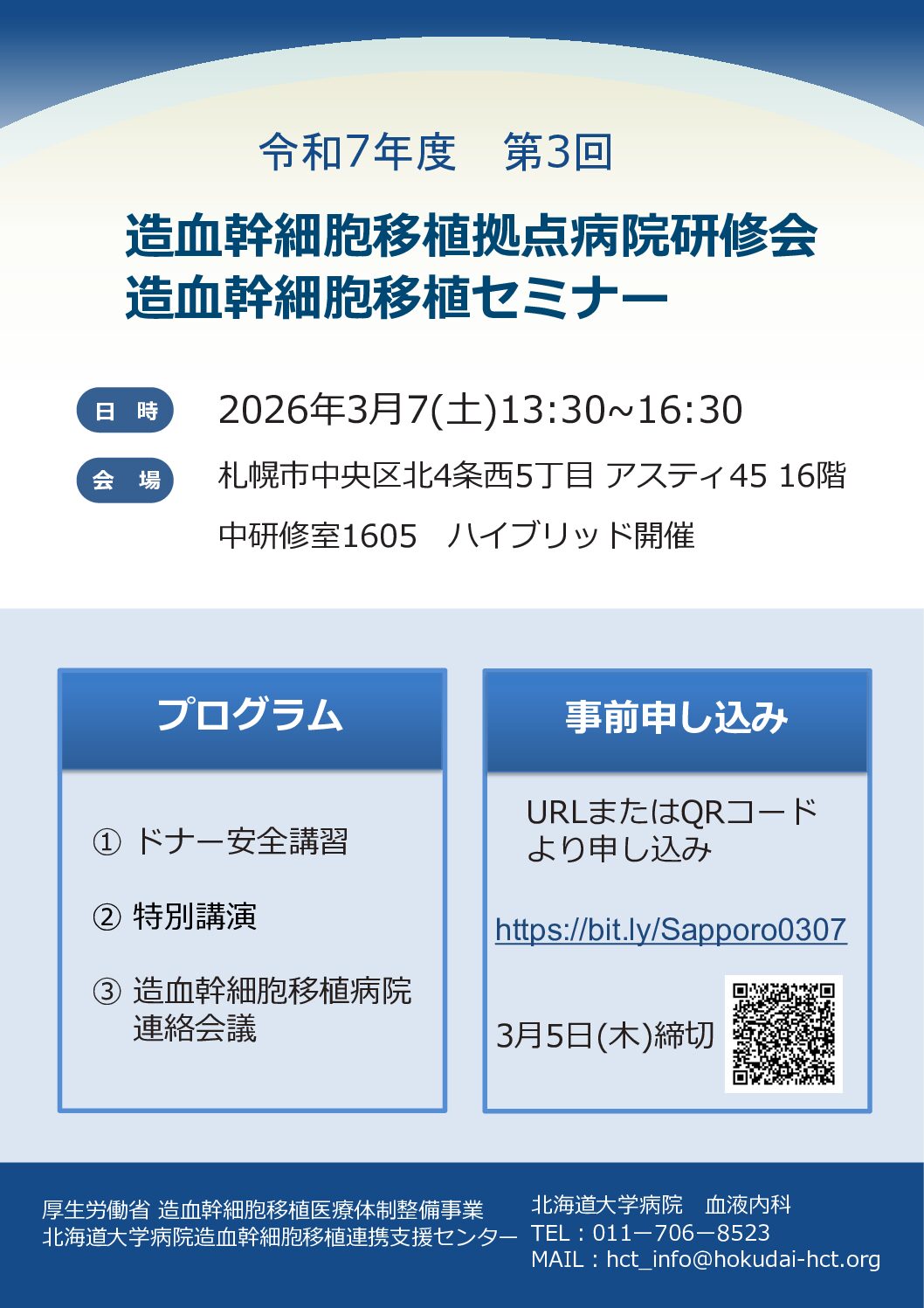 本セミナーは、造血幹細胞移植治療について理解を深めることを目的として開催しております。移植医療に携わるすべての施設及び職種の方々のご参加をお待ちしております。今年度もハイブリッド開催といたしますので、ぜひ会場にも足をお運びください。